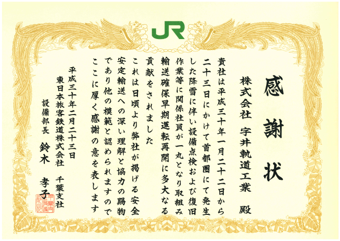 2018年2月 東日本旅客鉄道株式会社 千葉支社より感謝状を頂きました。