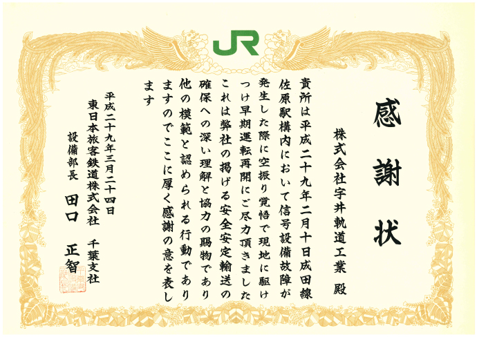 2017年3月 東日本旅客鉄道株式会社 千葉支社より感謝状を頂きました。