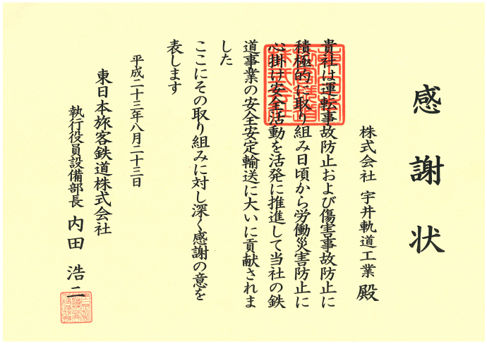 宇井軌道工業が受領した感謝状の一部をご紹介します。
